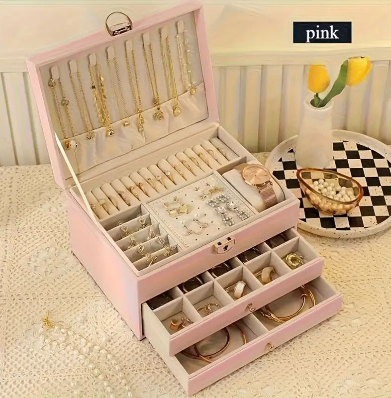 Çift Çekmeceli Anahtarlı Suni Deri Pembe Takı Kutusu
