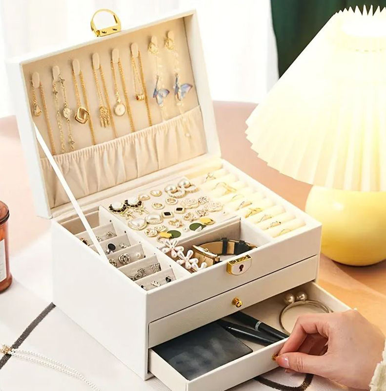 Çift Çekmeceli Anahtarlı Suni Deri Beyaz Takı Kutusu